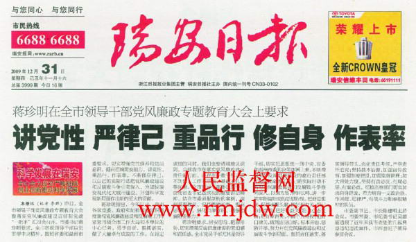 但当地的报纸《瑞安日报》却刊登着市委书记号召广大干部要修品行严律己。