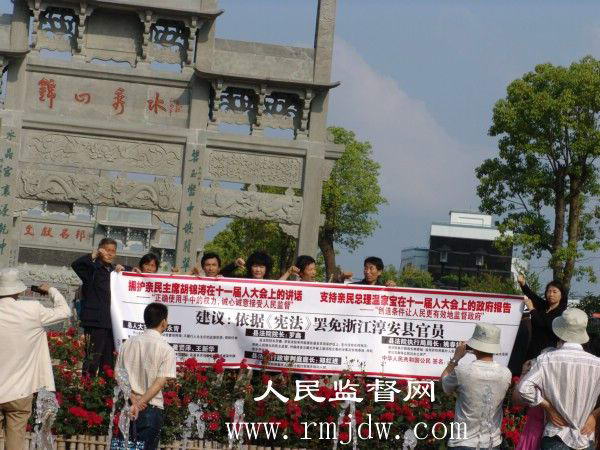 2008年5月10日,浙江省淳安县千岛湖风景区众位公民打着横幅——建议:依据《宪法》罢免浙江淳安县官员。此和平倡议持续了大约一个小时。