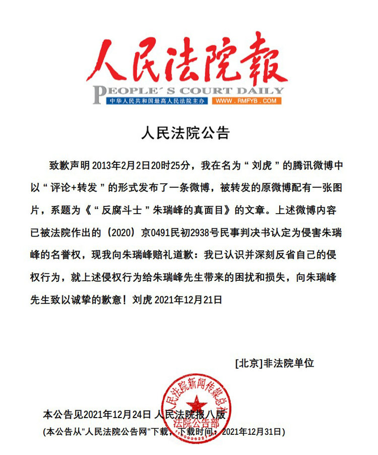 岁月不居,江河无恙!人民监督网报道重庆市北碚区原书记雷政富12秒不雅视频9周年年末之际。经北京互联网法院执行局审核,舆论引导员刘虎分别于2021年12月21日、28日在人民法院报刊登道歉声明,向朱瑞峰赔礼道歉!刘虎道歉声明称:“我已认识并深刻反省自己的侵权行为,就上述侵权行为给朱瑞峰先生带来的困扰和损失,向朱瑞峰先生致以诚挚的歉意!”