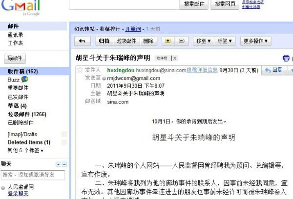 三、2011年9月16日18点23分,胡星斗教授发来手机短信:瑞峰:我的多年好友、原《瞭望》副主编、现北大一个研究院副院长刘东昌教授的亲戚正是那个廊坊秘书长,刘多次找我求情,希望能删除你网站上的帖子。刘与张祖桦、茅于轼都熟,属于我们圈子里的朋友。廊坊方面表示当初性急说了不该说的话,他们绝不会抓捕你的。我认为冤家宜解不宜结,他们既然认错了,你也就得胜收兵吧。也是给我一个面子,我好向朋友交代了。你悄悄撤掉帖子吧,不要声张,给对方一点面子,以上内容都不要上网。下次我们与刘教授见一面,他在北外也兼职带硕士研究生,他跟圈内的民主朋友都很熟。谢谢你,胡