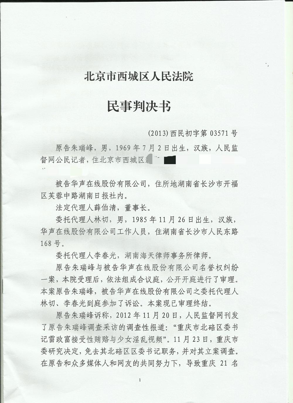 去年发放重庆官员淫乱视频的“人民监督网”主编朱瑞峰,控告湖南日报旗下的“华声在线”名誉侵权案,周二在北京西城区法院一审判决,裁定“华声在线”败诉,需要在网站置顶连续30天发布道歉公告,向朱瑞峰赔礼道歉,并赔偿朱瑞峰精神损害金3万。判决书上以“公民记者”的身份来形容朱瑞峰,这也是首次在司法机关承认有“公民记者”的存在。