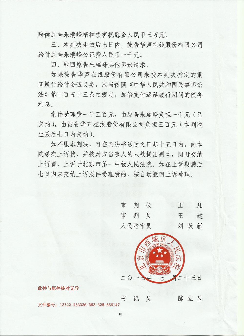2013年7月23日,北京西城区法院对朱瑞峰控告湖南官媒名誉侵权案做出一审判决,判决书中以“公民记者”来形容朱瑞峰的身份。(朱瑞峰提供)