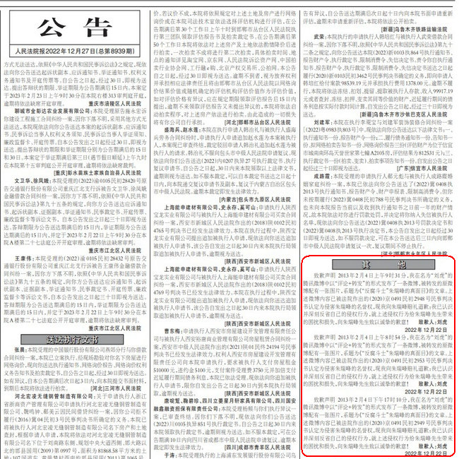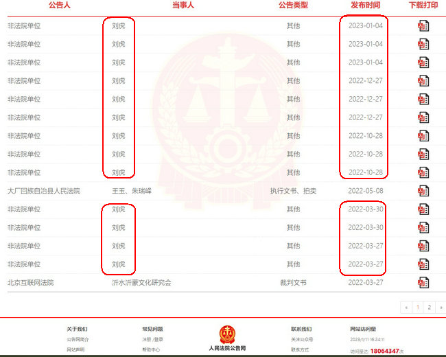 刘虎目前涉及多起民事侵权案件的诉讼官司,也是北京市多家法院强制执行的“小赖”。刘虎曾因拒不刊登道歉公告被北京市海淀区人民法院执行局依法将其列入失信被执行人名单,并下达限制消费令。