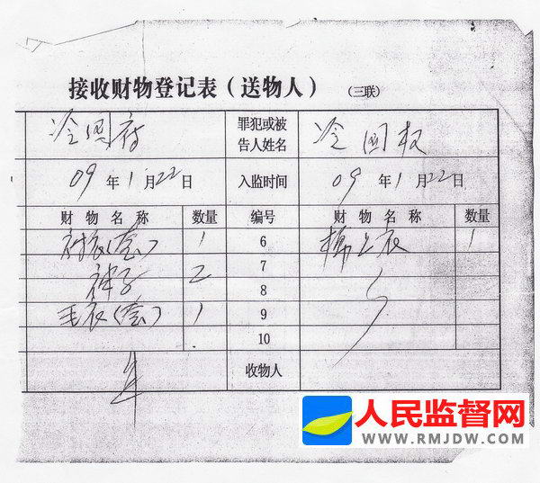图:家属向丹东市公安局看守所为冷国权送衣物登记表