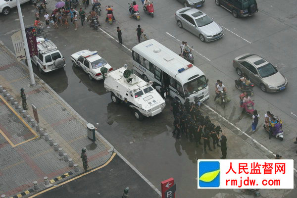 8点多钟,警方将10多人带出大楼,蹲在楼下空地,一个小时后又有一批人员被警察带出。人民监督网记者大约统计了一下人数,足有40多人。