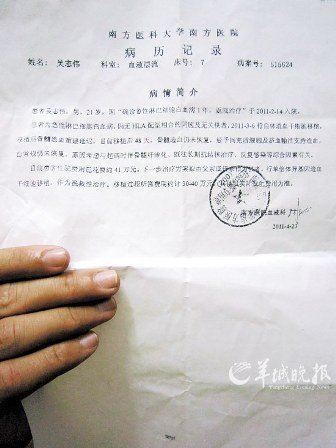 吴父接受记者采访时说,去年4月吴志伟被确诊白血病后接受了不少于8次的化疗,这其间因为肺结核病进行了一次肺部手术。用了大约40万元。今年2月14日,病情逆转,至今治疗费已花去近50万元,加上去年的治疗费用已近90万元。记者在吴志伟的住院清单上看到,仅4月29日一天,吴志伟的治疗费就多达24236.48元。