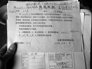 2009年年底,实在受不了昼夜痛苦煎熬的丁吉昌到淄博市职业病防治院做检查,对方开具了“住院通知书”。在该通知书上,记者看到丁吉昌被初诊为疑似职业病人。“其实,医生说的很明白,就是尘肺,但是要想确诊开诊断证明书就要住院。这需要缴纳12500元的住院费用,我每个月只有86元的退休费,实在缴不起。”