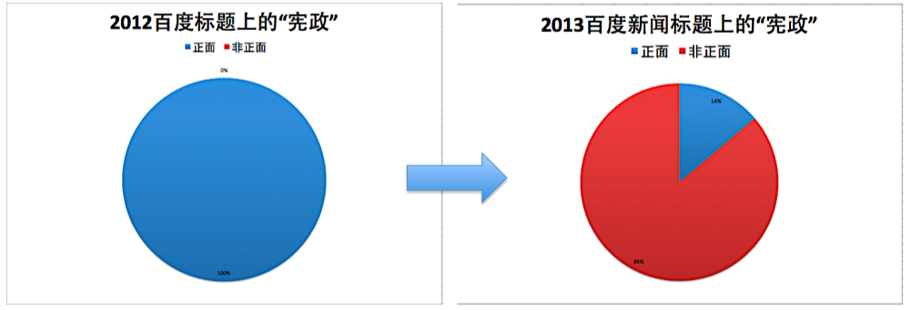 使用“百度新闻高级搜索”可见,2013与上一年判然不同。2012,标题含“普世价值”的约150篇,正面使用的占78%。标题含“宪政”的文章约400篇(剔除了与中国宪政无关者,下同), 全部正面使用“宪政”一词。2013,标题含“普世价值”的约500篇,非正面使用者占84%。含“宪政”的文章约1200篇,其中非正面使用“宪政”者占86%。