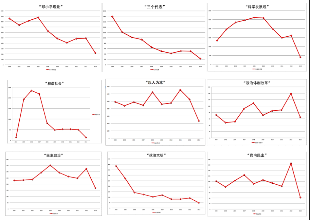笔者检索了自2004年至2013年十年间这一组政治词语的传播频率,所使用的数据库为人民日报,并与香港“慧科搜索”中的数百种中国内地报纸互为参照。人民日报的数据图像如下: