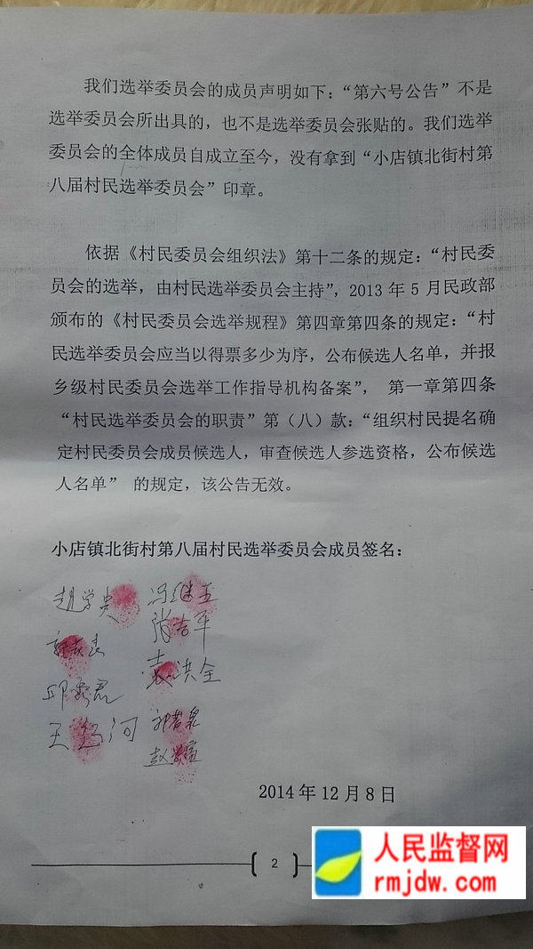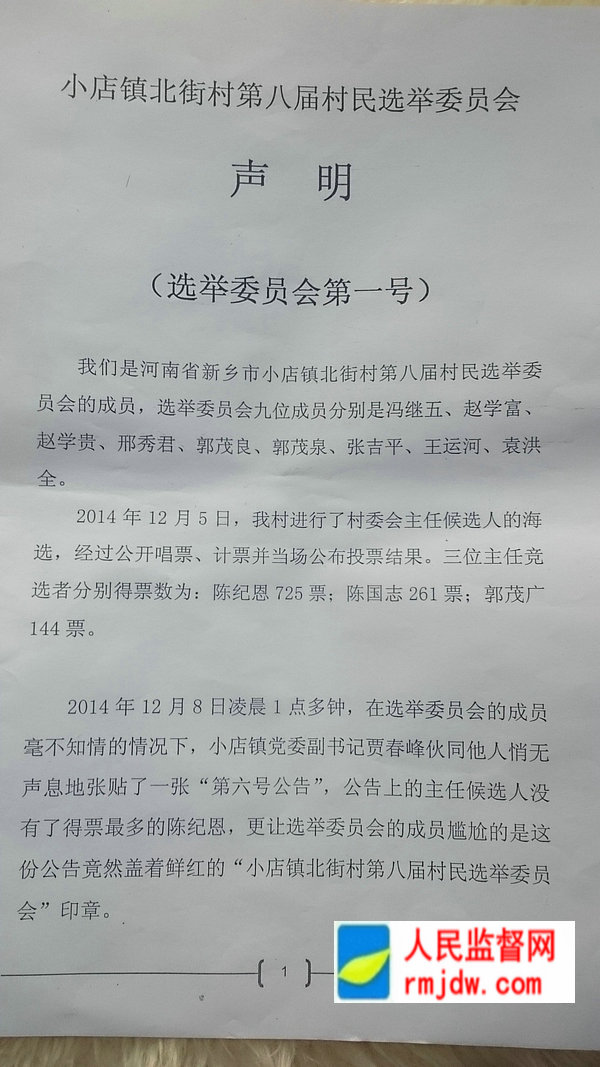 图:河南新乡市红旗区小店镇北街村选举委员会声明