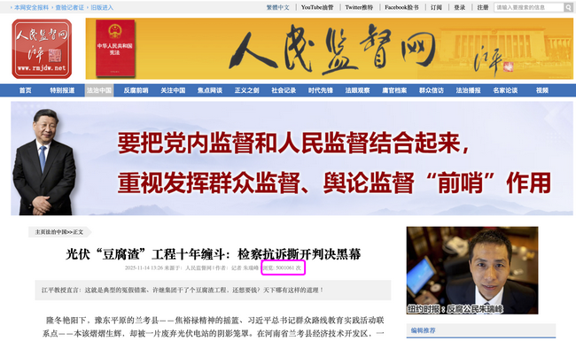 震撼全网的爆款报道来了!《光伏“豆腐渣”工程十年缠斗:检察抗诉撕开判决黑幕》仅35天浏览量超500万+(X平台曝光548万人次),撕开光伏行业隐秘黑幕,引发社会热议!