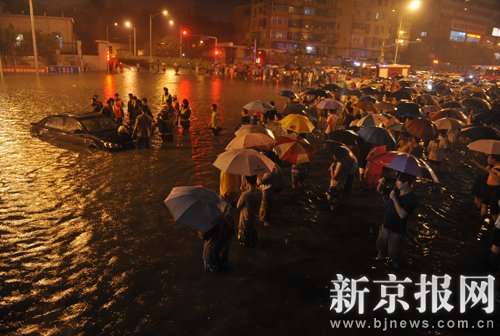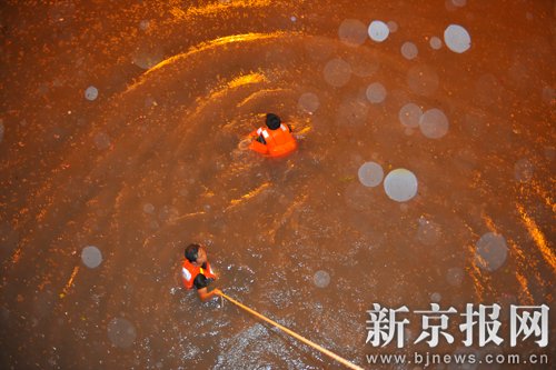 昨晚,暴雨使广渠门桥下一片汪洋,五辆车搁浅水中,救援人员赶来拖拽水中车辆。