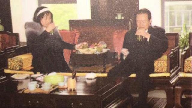 据澎湃新闻翻拍的照片显示,2010年左右,时任中共中央政治局常委的周永康(右)与妻子贾晓晔在一家茶文化博物馆品尝碧螺春。