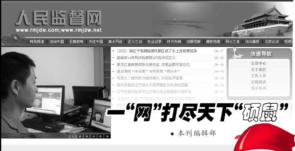 “人民监督网”以红色为主调,“五星红旗”、“天安门”一片红色的海洋。在网站的醒目位置,高挂着胡锦涛总书记、温家宝总理的照片和指示。“正确行使手中的权力,诚心诚意接受人民监督”……几行大字赫然在目。